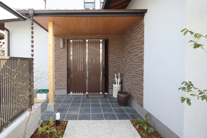外壁は落ち着いた色で塗装し、玄関ドアも一新して和モダンの印象に。